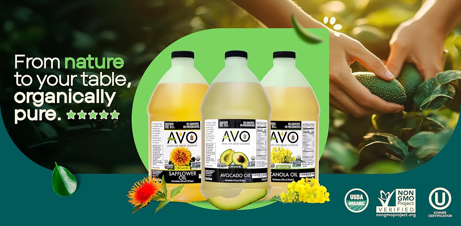 AVO ORGANIC 100% High Oleic SAFFLOWER Oil Frying, Baking, Non-stick Sautéing, Salads, Vinaigrette, Marinades, Pan Coating, General Cooking 64 Fl-oz (Half a Gallon), NO preservatives added, Naturally Processed